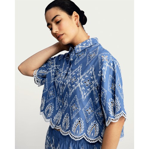 Pure Cotton Embroidered Cropped Blouse in Blue