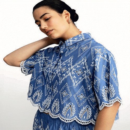 Pure Cotton Embroidered Cropped Blouse in Blue