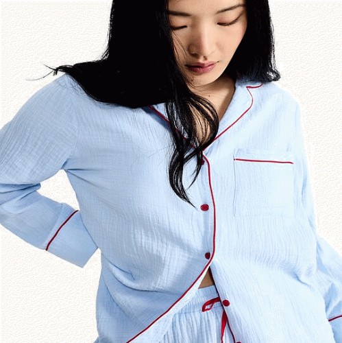 Pure Cotton Textured Contrast Trim Pyjama Set in Blue