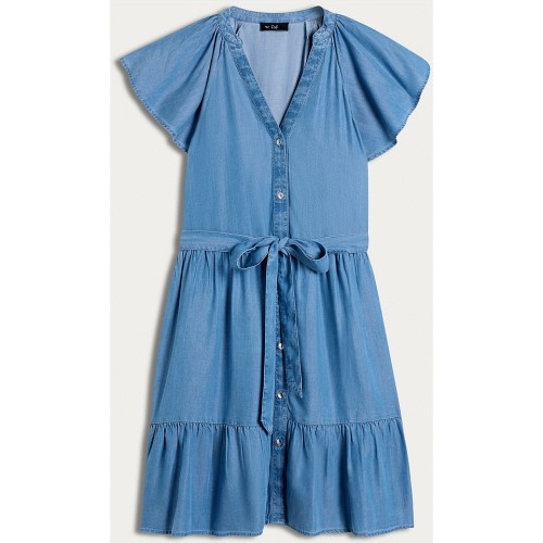 Pure Lyocell Button Front Tie Waist Mini Dress in Blue