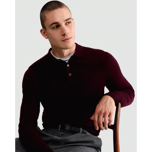 Pure Merino Wool Long Sleeved Polo Shirt in Burgundy