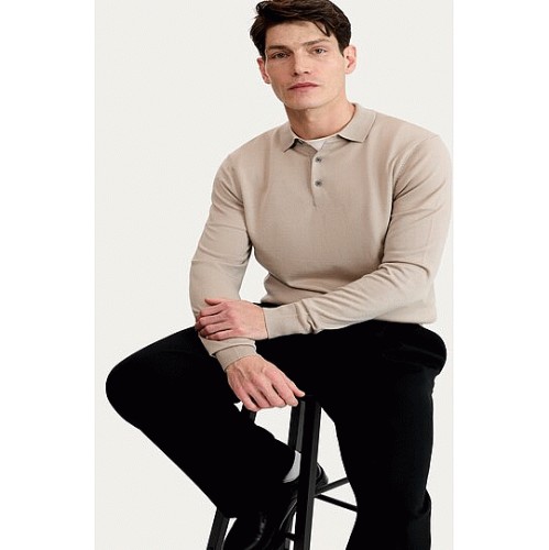 Pure Merino Wool Knitted Long Sleeved Polo Shirt in Neutral