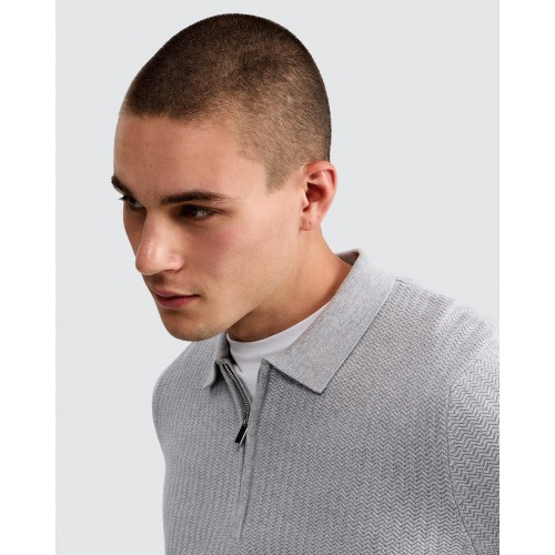Pure Cotton Herringbone Textured Long Sleeved Polo Shirt in Grey Marl