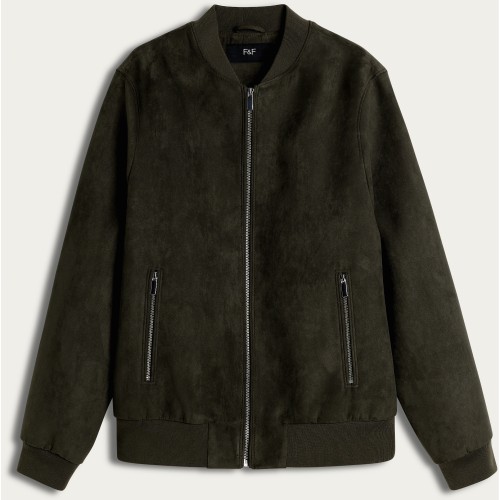 Faux Suede Zip Up Bomber Jacket in Khaki