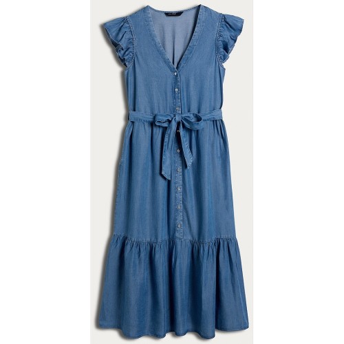 Pure Lyocell Button Front Belted Midi Dress in Blue