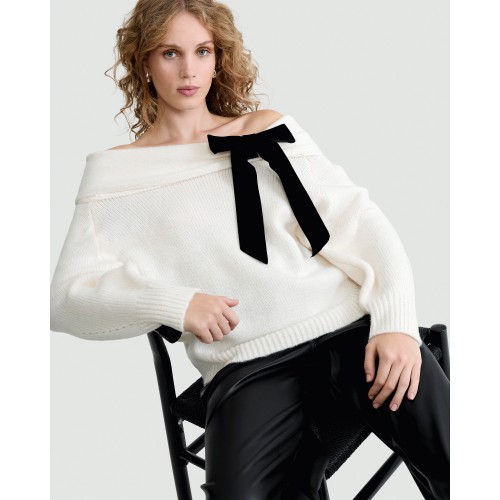 Ribbed Velvet Bow Bardot Jumper with Wool in Cream