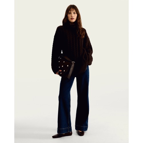 Cable Knit Roll Neck Jumper with Wool in Brown