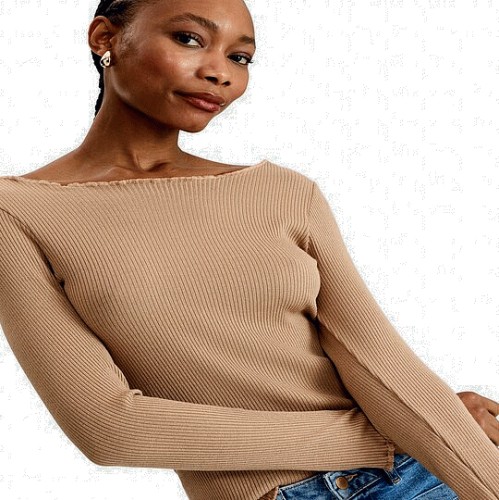 Ribbed Frill Accent Long Sleeved Top in Brown