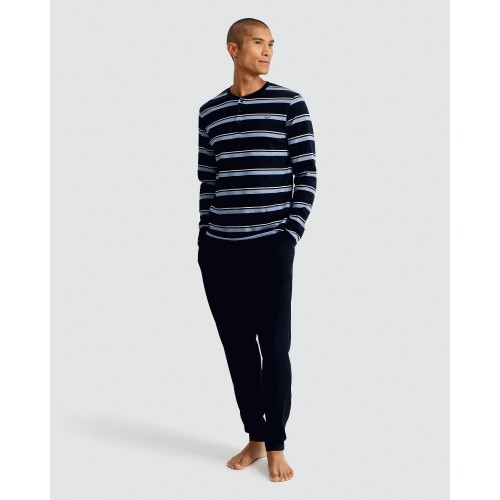 Pure Cotton Stripe Print Henley Top and Joggers Pyjamas in Navy