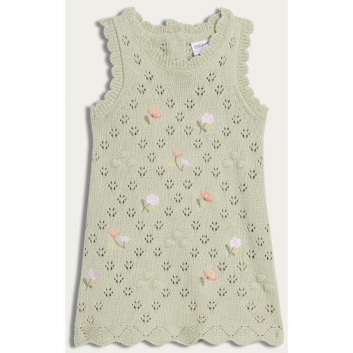 Pure Cotton Knitted Embroidered Sleeveless Dress in Green
