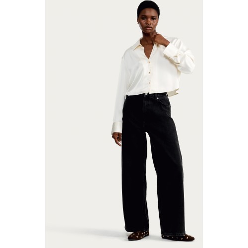 Satin Cropped Button Up Shirt in Black