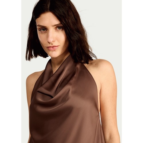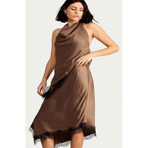 Satin Lace Trim Halter Neck Co-ord Top in Brown