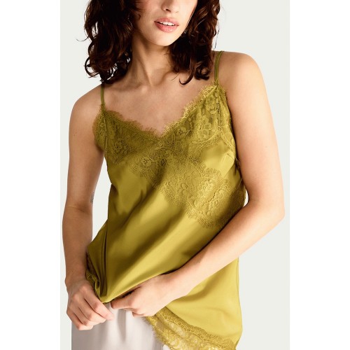 Satin Lace Trim Asymmetric Hem Cami Top in Green