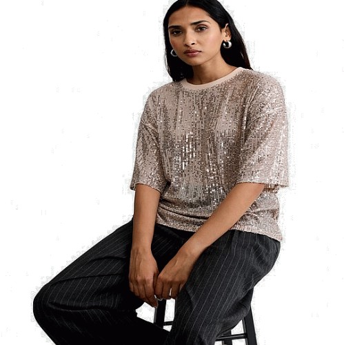 Sequin Embellished Boxy Short Sleeved Top in Cream