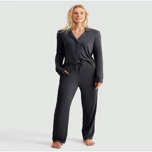 CoolEase Ribbed Button Up Shirt and Trousers Pyjamas in Grey