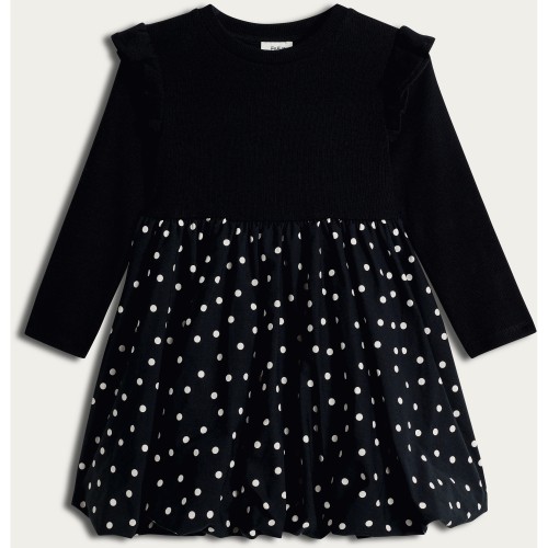 F&F Girls Cotton Rich Polka Dot Long Sleeved Dress in Multi Black White