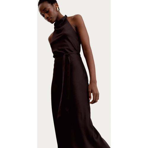 Satin Cowl Neck Sleeveless Midi Dress in Chocolate