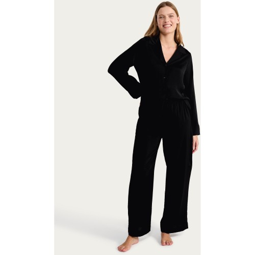 CoolEase Satin Revere Button Up Pyjama Set in Black