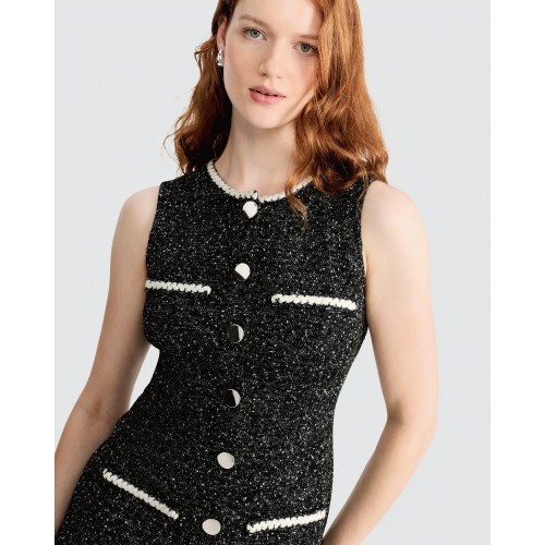 Tweed Button Through Sleeveless Dress in Multi Black White