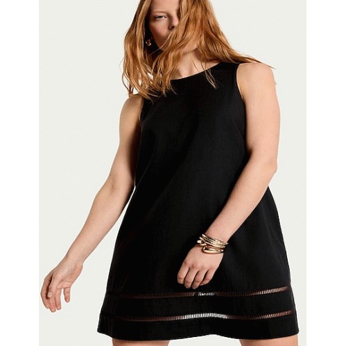 Ladder Trim Hem Sleeveless Mini Dress with Linen in Black
