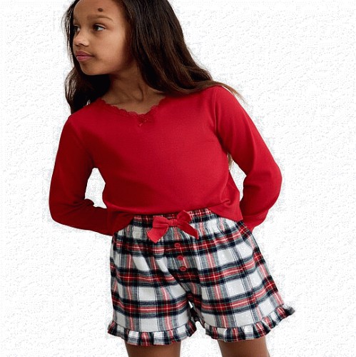 Girls Lace Trim Top and Check Print Shorts Pyjamas in Red Multi