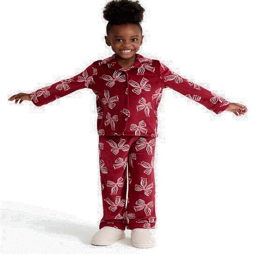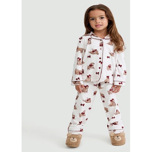 Girls Fleece Bow Print Revere Shirt and Trousers Pyjamas in Burgundy