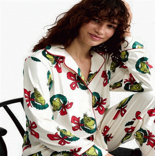 The Grinch Fleece Wreath Print Shirt and Trousers Pyjamas in Stone