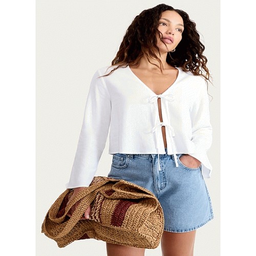 Tie Front V Neck Blouse in White