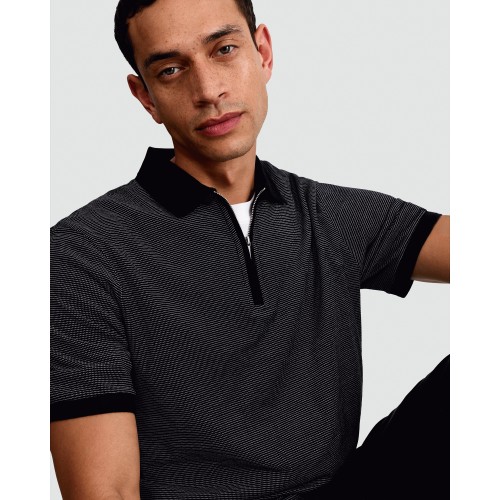 Cotton Rich Striped Zip Neck Short Sleeved Polo Shirt in Black