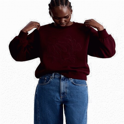 Cotton Rich Floral Applique Embroidered Sweatshirt in Burgundy