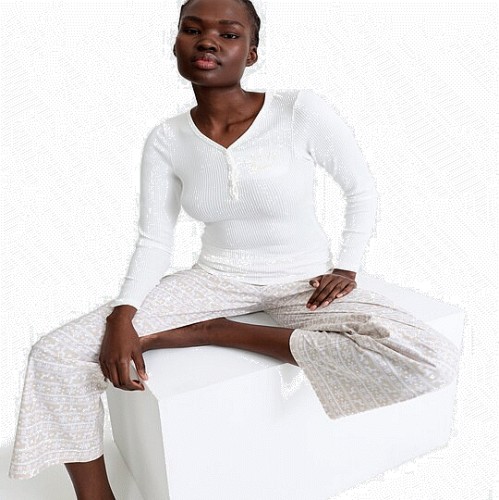 Ribbed Festive Henley Top and Trousers Pyjamas Set in Cream