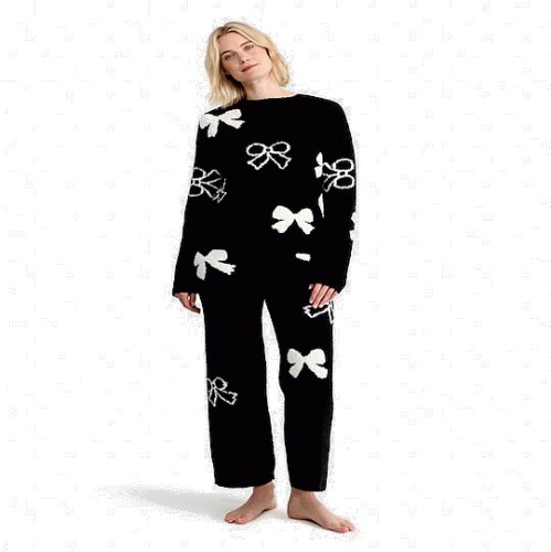 Textured Bow Print Sweatshirt and Trousers Pyjamas in Black