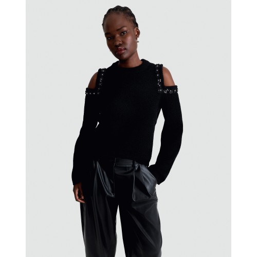 Cold Shoulder Sequin Embellished Jumper with Wool in Black