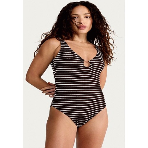 Crinkle Textured Striped Ring Detail Swimsuit in Multi Brown