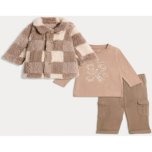 3-Piece Textured Jacket Top and Cargo Trousers Set in Stone