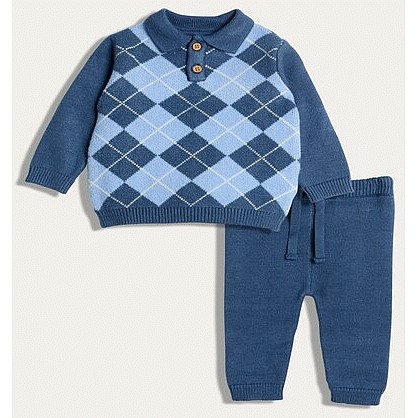 2-Piece Argyle Knitted Polo Top and Joggers Set in Navy