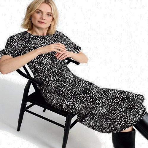 Polka Dot Puff Sleeve Midi Dress in Multi Black White