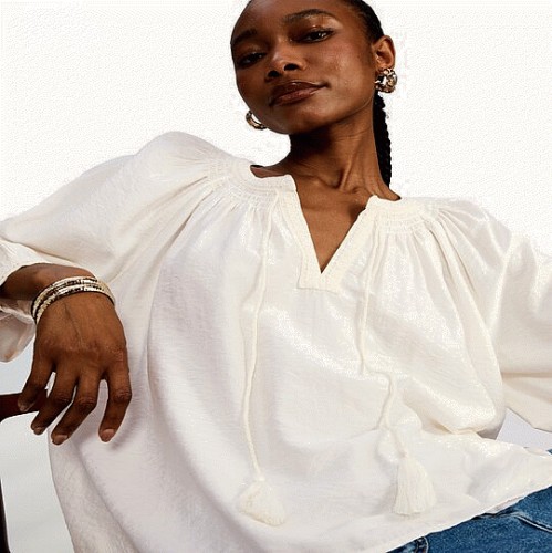 Textured Tie Neck Balloon Sleeve Blouse in Cream