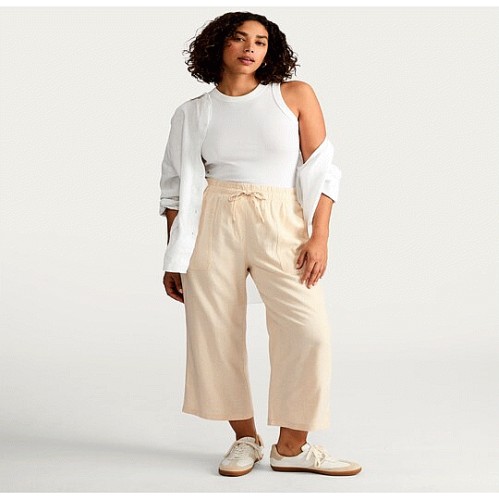 Tie Waist Cropped Wide Leg Trousers with Linen in Neutral