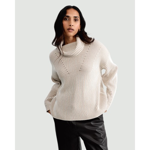 Ribbed Cotton Rich Two Tone Roll Neck Jumper in Neutral