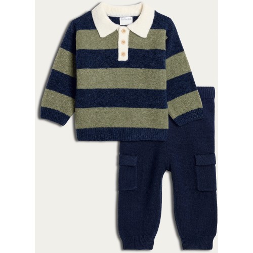 Knitted Stripe Print Jumper and Cargo Trousers Set in Green