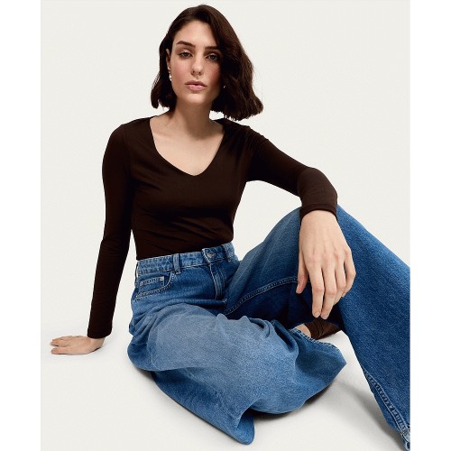Polyamide V Neck Long Sleeved Top in Chocolate