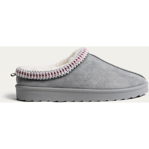 Fleece Lined Contrast Detail Mule Slippers in Grey