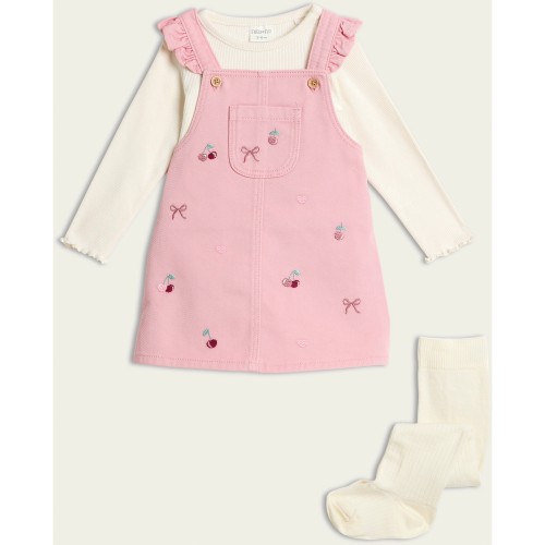 3-Piece Cotton Rich Cherry Embroidered Pinny Bodysuit and Tights Set in Pink