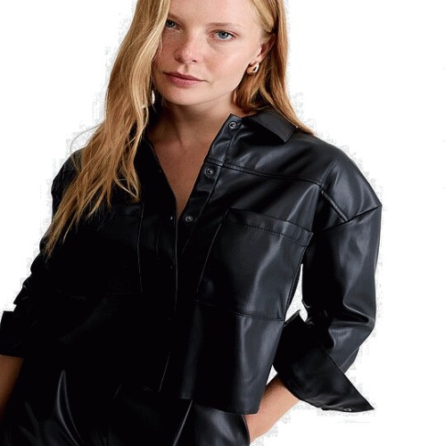 Faux Leather Bubble Hem Zip Up Jacket in Brown