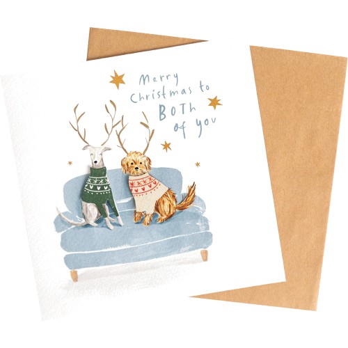 To Both of You Christmas Card with Fun Dogs on Sofa with Antlers Greeting Card