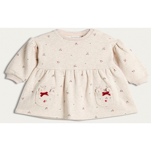 Cotton Rich Floral Print Reindeer Pocket Dress in Stone