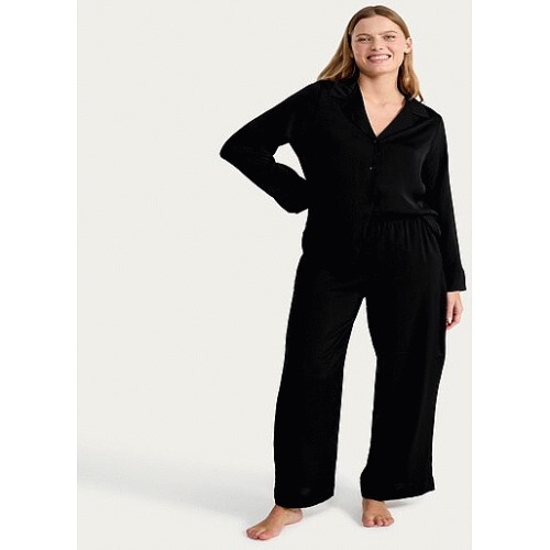 CoolEase Satin Revere Button Up Pyjama Set in Black