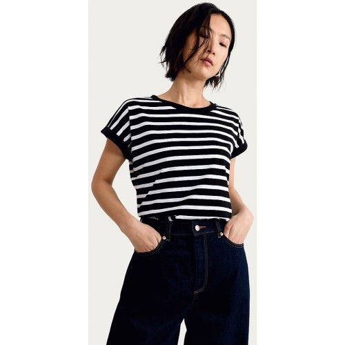Pure Cotton Striped Short Sleeved T-Shirt in Multi Black White