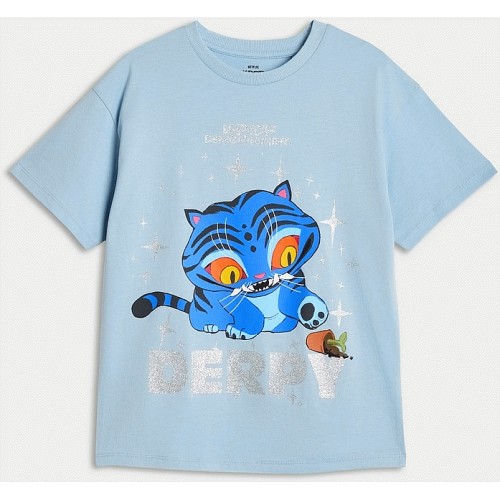 K-Pop Demon Hunters Pure Cotton Derpy Cat Print T-Shirt in Blue